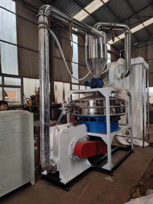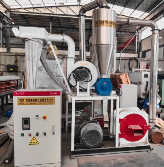In terms of capacity, this PVC grinding machine is designed according to actual PVC processing conditions. The finished powder size is stable, and the output can reach 150–200 kg per hour, meeting common PVC pulverizing requirements. At the same time, the machine is equipped with a complete air conveying and dust collection system, including an induced draft fan, rotary airlock valve, and bag dust collector. This system effectively reduces dust leakage, improves the working environment, and supports long-term continuous operation of the plastic pulverizer.